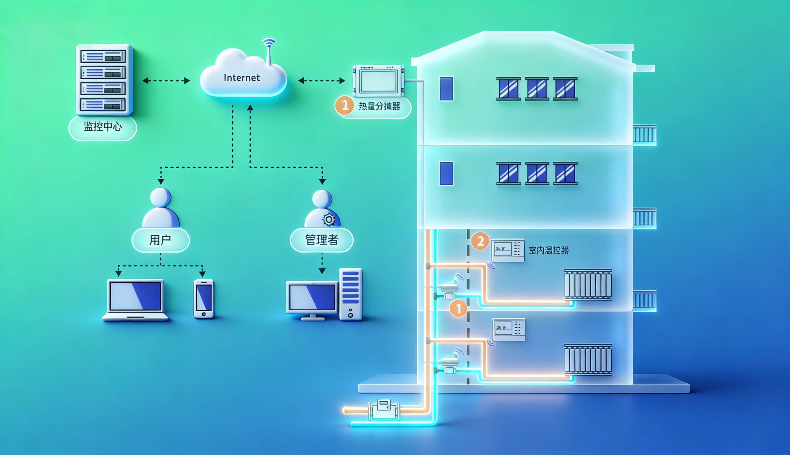 ① 热量分摊器支持热量表串联、热量表并联、虚拟总表等多种分摊模式。